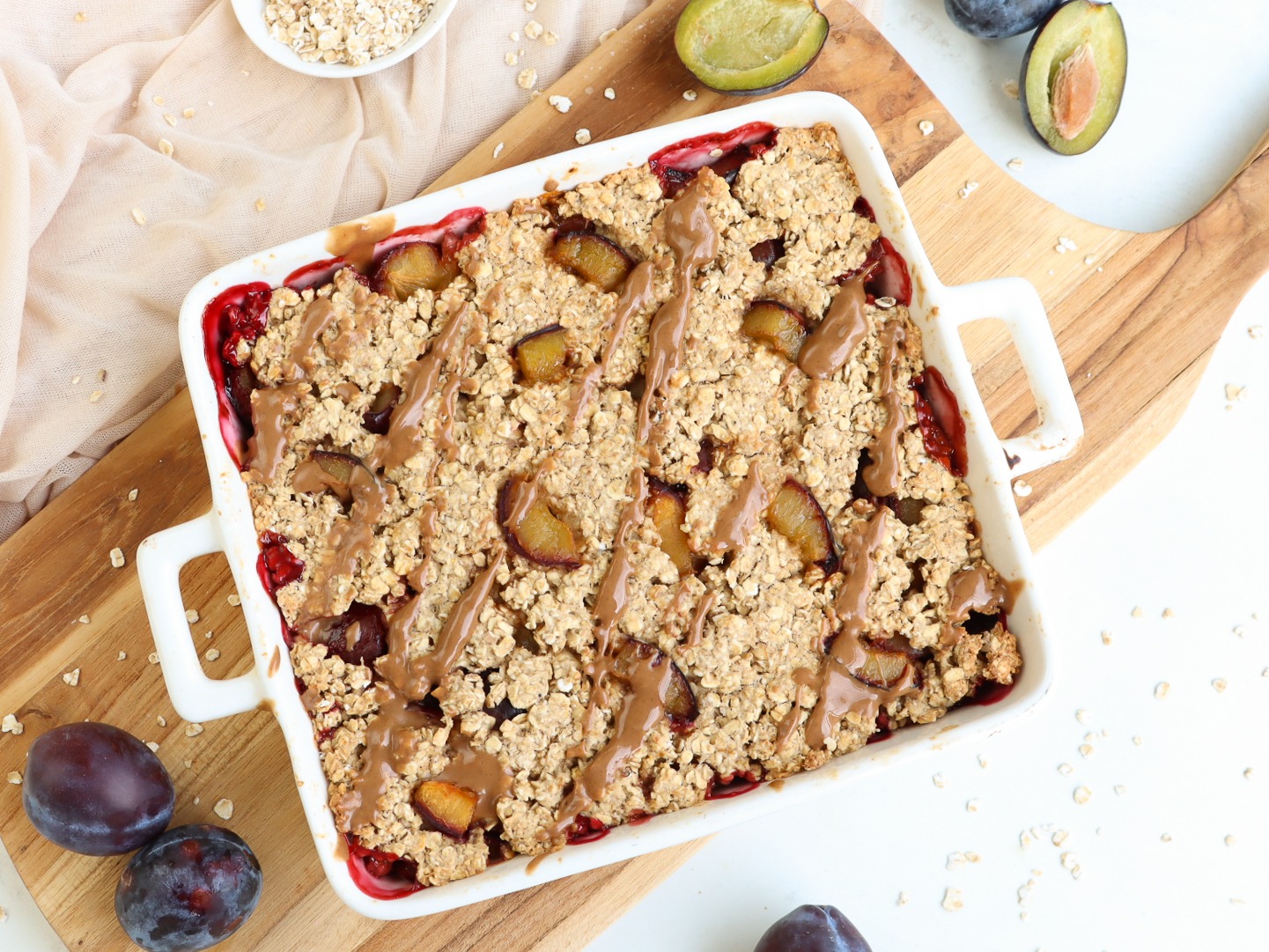 Priprava vzame le nekaj minut, sestavine pa so takšne, da jih skoraj zagotovo že imate v kuhinji. Ko se med peko vse sestavine povežejo, nastane popolna kombinacija okusov in tekstur – mehko, hrustljavo, sočno in aromatično. Sladko-kiselkast okus sliv se čudovito ujema z bogato ovseno osnovo in ustvari sladico, ki je hkrati nasitna in osvežilna. Ne glede na to, ali uporabite sveže ali zamrznjene slive, sladica vedno izpade okusna in sočna.