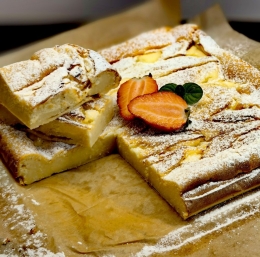 Še toplo sladico posujemo s sladkorjem v prahu in okrasimo s svežim sadjem. Narežemo na kose in postrežemo.