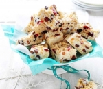 250 g kokosove maščobe 140 g sladkorja v prahu 180 g rozin 100 g sesekljanih kandiranih češenj 100 g sesekljanih suhih marelic 85 g kokosove moke 106 g polnomastnega mleka v prahu 40 g riževih kosmičev