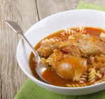 Dodamo meso, začimbe, na kockice narezano svežo papriko in poper. Dušimo do mehkega, torej dobre pol ure. Pazimo, da se meso ne razkuha.