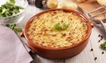 2 Ko je krompir kuhan, ga odcedimo in vrnemo v lonec, kjer ga pustimo par minut, da izpari še nekaj vode. Popramo po okusu, dodamo 20 g masla, nariban parmezan in mleko. Mleko dodajamo postopoma in po potrebi, vmes krompir tlačimo, da dobimo gladek pire, ki mora biti malo bolj redek, da ga bomo lažje razporedili po pekaču.