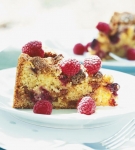 Preostalo testo s čajno žličko v kepicah razporedimo po amarettih in malinah in enakomerno razmažemo. Posujemo s preostalimi amaretti in polovico preostalih malin. Pečemo približno 1 uro in 10 minut, da je zobotrebec, ki ga zapičimo v sredino kolača, čist, ko ga izvlečemo.
