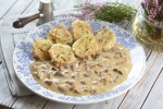 1-2 žlici olja 1 žlica masla 1 čebula 1 kg poljubnih svežih gob 2 stroka česna 400 ml goveje jušne osnove 200 ml smetane za kuhanje sol in sveže mleti poper lovor in timijan po želji 1-2 žlički gorčice Kruhovi cmoki 8 en dan starih žemelj 2 žlici olja 2 manjši čebuli 4 jajca 300 ml mleka sol, poper, mleti muškatni orešček po okusu moka po potrebi manjši šopek peteršilja