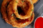 Čebulne obročke najprej potopimo v pripravljeno testo, nato jih povaljamo v drobtinah, da so enakomerno obloženi.