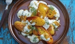 Začinite s soljo in poprom. Topel krompir dodajte začinjeni smetani in premešajte. Potresite z nasekljanim koprom in postrezite.