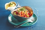 Koriander operemo, osušimo in nasekljamo. Zmešamo kislo smetano s kari, koriandrom, česnom in soljo, solato postrezite v skledi s prelivom.