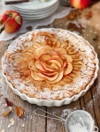 Na krhlje narezana jabolka položimo na testo, lahko v obliki rožice, in počasi prelijemo z vaniljevo kremo.