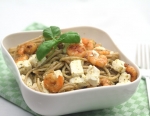 Rezance zmešamo s pestom, dodamo feta sir in okrasimo s kozicami. Na koncu vmešamo še sir.
