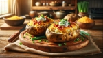 4 veliki krompirji (primerne sorte za pečenje). 150 g naribanega sira (npr. cheddar ali mocarela). 100 g slanine, narezane na koščke. 100 g kisle smetane. 2 stebli zelene čebule, narezani na tanke kolobarje. 2 žlici masla. 2 žlici olivnega olja. Sol, poper po okusu.