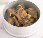 200 g temne čokolade (70 % kakava) 200 g bele čokolade 250 g masla 300 g rjavega sladkorja 4 jajca 140 g moke maslo za model