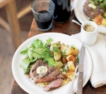 3 veliki rdeči krompirji 2 žlici oljčnega olja 1 strok česna majhen šopek peteršilja 2 goveja steaka (file ali hrbet) po 150 g kanček olja za steake 1 žlička strtega črnega popra košček masla sol vodna kreša za solato