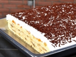 Sedaj dodamo še zadnjih 160 g piškotov in pokrijemo s preostalo kremo.
