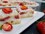 Preko testa prelijemo kremo in posujemo z jagodami. Po vrhu dodamo še jagodno marmelado in potrosimo preostanek testa.