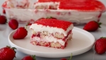 V modelu velikosti 23×33 cm hitro pomakamo piškote v jagodno-mlečno mešanico (1–2 sekundi) in jih razporedimo po dnu. Nanesemo polovico mascarpone kreme in jo lepo poravnamo. Čez kremo namažemo gosto jagodno omako.
