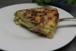 Po plasteh zložite na tanke rezine narezan krompir, začinjen s soljo. Dodajte plast šunke in potresite s sirom.