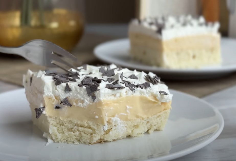 Ohlajen biskvit enakomerno navlažite z mlekom, zmešanim z rumom. Nato razporedite kremo, nato pa po vrhu dodajte stepeno smetano in na koncu posujte z naribano čokolado.