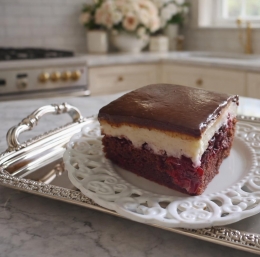 To višnjevo pecivo združuje čokoladni biskvit, sadni preliv in kremasto plast.