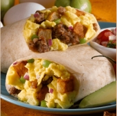 Jajca v koruzni tortilji s slanino, paradižnikom, čebulo in sirom (Burrito)