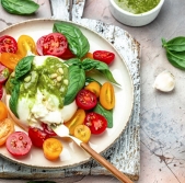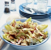 Solata s hruško, datlji in orehi ter prelivom iz sira z modro plesnijo