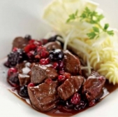 Gamsov ragu z omako iz jagodičja in pirejem iz zelene