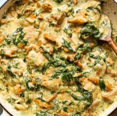Piščanec z lisičkami in špinačo v smetanovi omaki