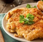 Ocvrti telečji zrezki v panadi z limono, parmezanom in pinjolami