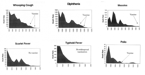 Podatki, ki jih je zbrala nacionalna zdravstvena zveza (NHF) in jih je poročala Cynthia A. Janak z RenewAmerica.com, pripovedujejo resnično zgodbo o tem, kako so bile skoraj vse večje nalezljive bolezni 20. stoletja že v izginotju, veliko preden je prišlo na sceno povezano cepivo. scena. To dejstvo je jasno ponazorjeno v grafih, ki jih je pripravil NHF, ki vsebujejo vitalne statistične podatke iz uradnih javnih zdravstvenih evidenc ZDA.