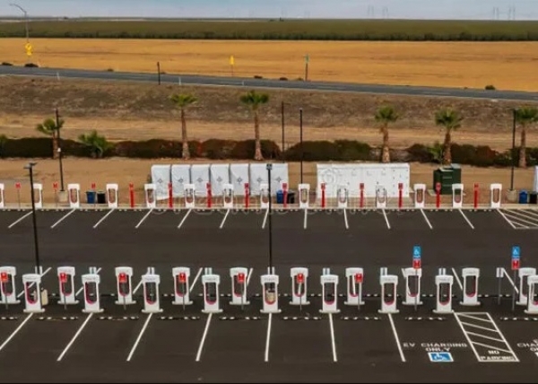 Postaja Harris Ranch Tesla Supercharger z 98 polnilnimi postajami za električna vozila je impresiven objekt v Coalingi v Kaliforniji.