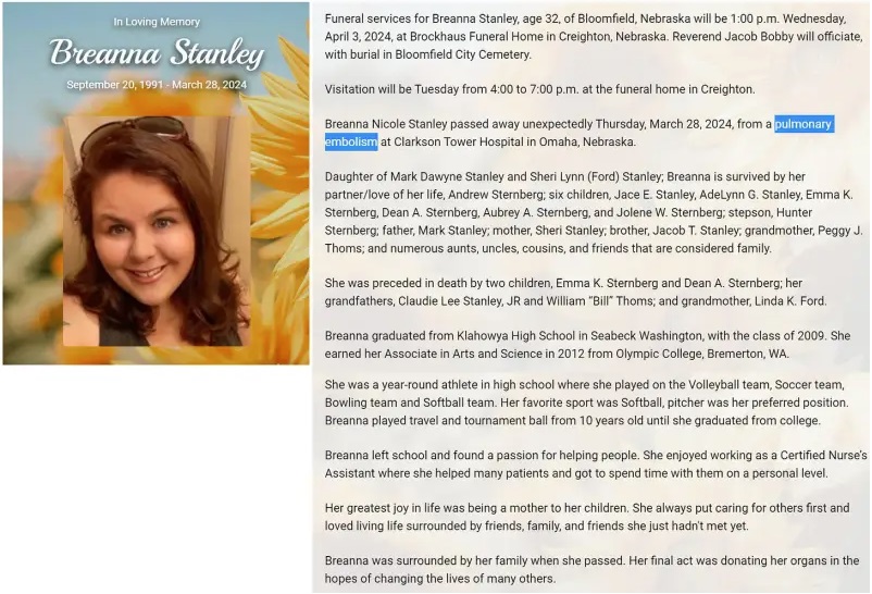 28. marec 2024 – Bloomfield, NE – Breanna Stanley, 32, diplomirana medicinska sestra, je 28. marca 2024 nenadoma umrla zaradi pljučne embolije.