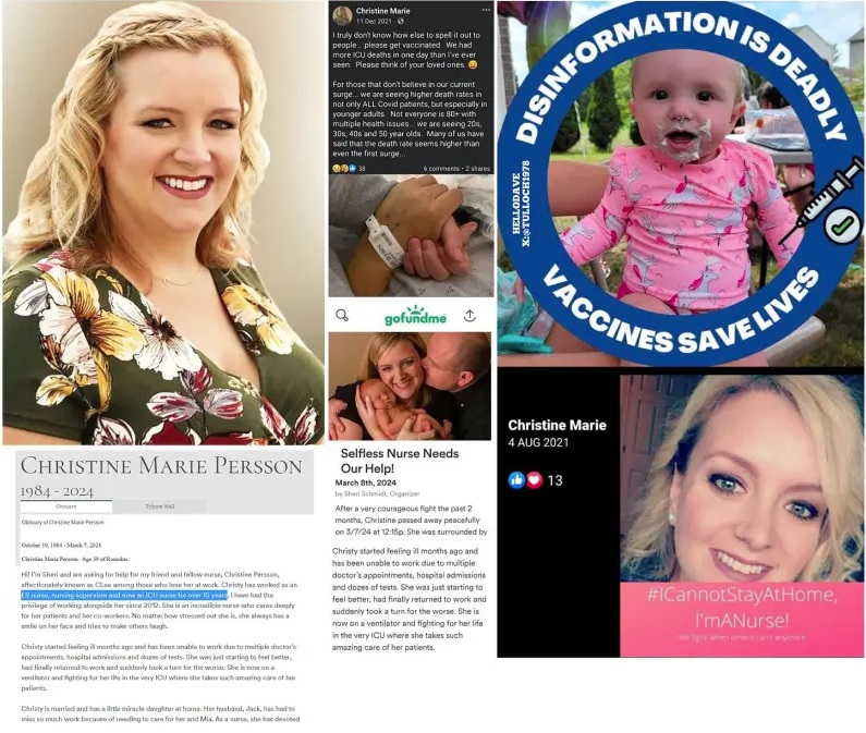 7. marec 2024 Christine Marie Persson, 39, registrirana medicinska sestra v Beaumont Waynu v Michiganu, je umrla 7. marca 2024, potem ko je bila dva meseca intubirana. Medicinska sestra na urgenci, medicinska sestra nadzornica, zdaj pa intenzivna sestra, je zbolela in pristala na ventilatorju.