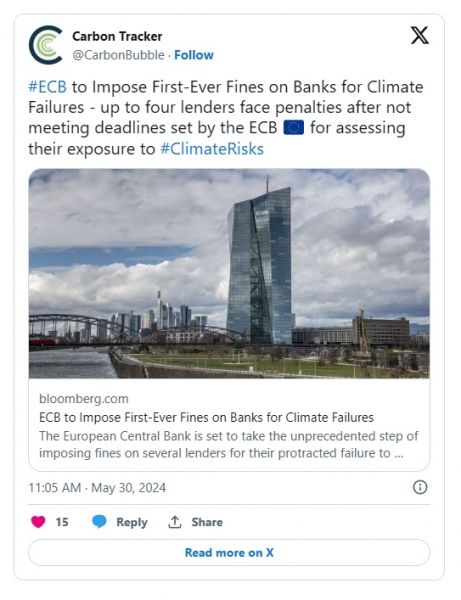 ECB pospešeno potiska podnebno norost in pravi, da bodo prve banke morale plačati kazni, ker ne spoštujejo svojih predpisov o neizpolnjevanju obveznosti.