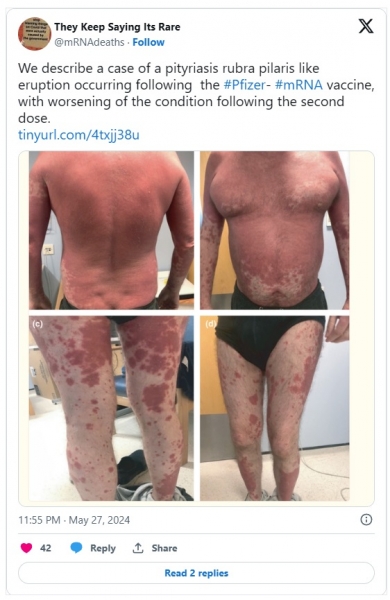 Uporabniki družbenih omrežij poročajo, da so po prejemu injekcije Covid začeli dobivati kožne bolezni, kot je ekcem, kar je ena študija dokumentirala. Čeprav ni posebej ekcem, je druga študija pokazala, da lahko injekcije povzročijo "izbruh, podoben pityriasis rubra pilaris".