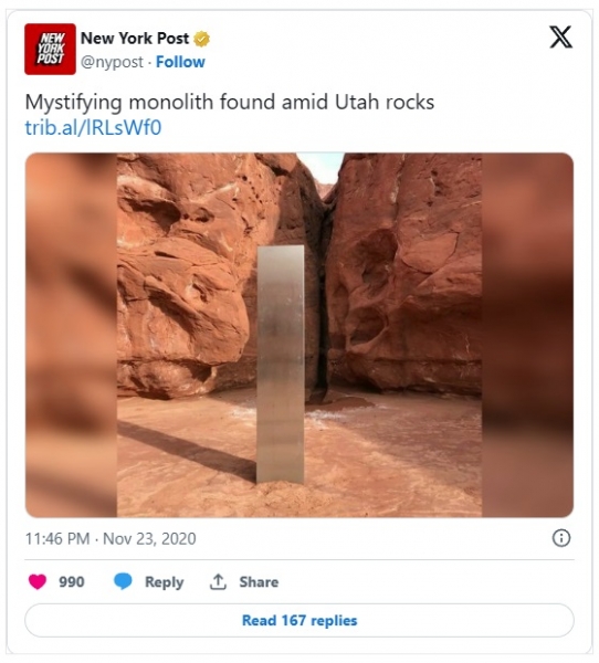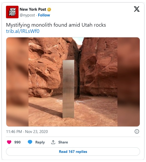 Leta 2020, na vrhuncu COVID-a, je nekdo odkril kovinski monolit na oddaljenem območju puščave Utah.