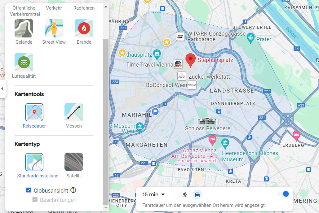 Google že nekaj časa izvaja funkcijo »Trajanje potovanja« (samo v namizni različici, ne v mobilni!). Najdete ga z gumbom »Sloji« – nato pojdite na »več« – in aktivirajte trajanje potovanja v podrazdelku »Orodja za zemljevide«. Nato za točko po vaši izbiri modra pikčasta črta in območje na zemljevidu prikazujeta, kako daleč lahko hodite – ali se peljete – v 15 minutah.