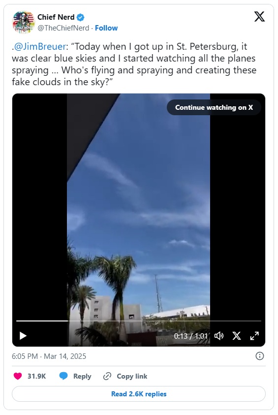 Breuer je guvernerja Floride in uradnike pozval, naj ugotovijo, kdo "ustvarja 'lažne oblake', ki se na nebu zadržujejo več ur," je nato vprašal, "kaj počnemo glede tega?"