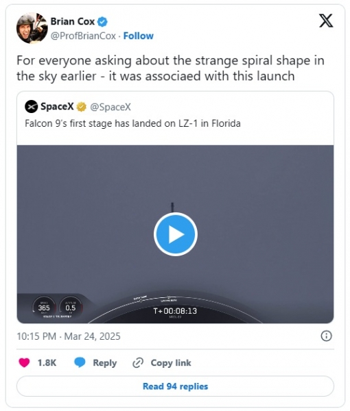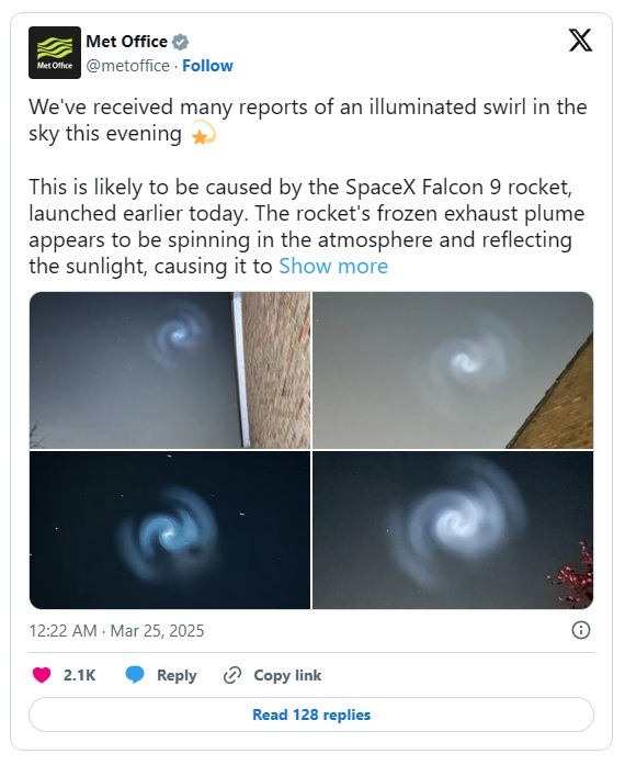 "Ta večer smo prejeli veliko poročil o osvetljenem vrtincu na nebu," je Met Office zapisal na X. "To je verjetno povzročila raketa SpaceX Falcon 9, ki je bila izstreljena danes. Zdi se, da se zamrznjeni izpušni oblak rakete vrtinči v ozračju in odbija sončno svetlobo, zaradi česar je videti kot spirala na nebu."