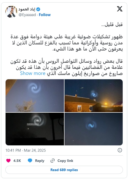 “Ovo je vjerojatno uzrokovano raketom SpaceX Falcon 9, lansiranom ranije danas. Čini se da se smrznuti ispušni oblak rakete vrti u atmosferi i reflektira sunčevu svjetlost, zbog čega izgleda kao spirala na nebu.”