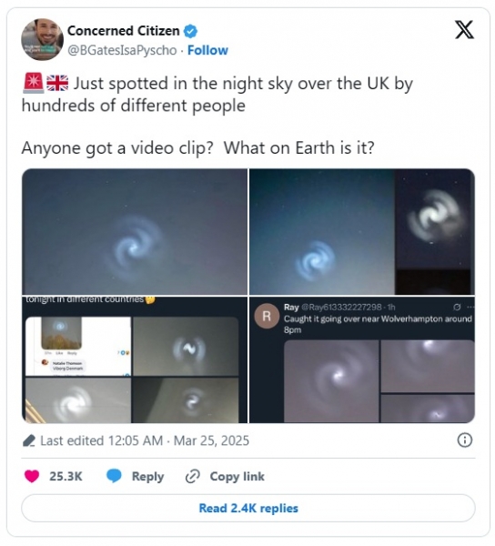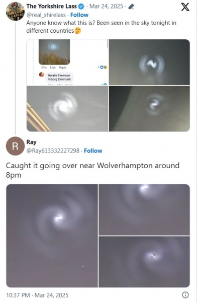 Skrivnostni prizor je presenetil milijone in sprožil ugibanja o nezemljanih ali drugih pojavih; vendar je meteorološki urad Združenega kraljestva pozneje pojasnil, da je to verjetno posledica izstrelitve rakete SpaceX prejšnji dan, kar je skrajno smešno.