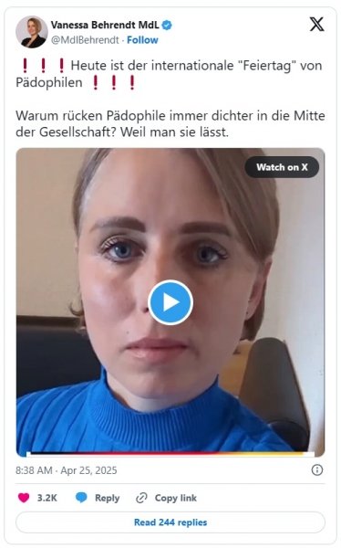 »25. april je dan, ki ga mnogi pedofili že leta praznujejo kot svoj neuradni 'praznik',« opozarja Vanessa Behrendt, tiskovna predstavnica za družinsko politiko pri parlamentarni skupini AfD v Spodnji Saški na Platformi X. »Na tako imenovani 'Alice' se povezujejo, praznujejo in namerno iščejo nove žrtve.«