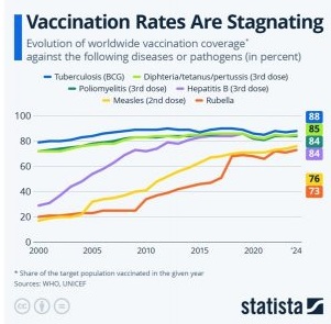 Ošpice ostajajo velika skrb, glede na lažne novice in zahodno medicinsko industrijo, saj je bila stopnja cepljenja leta 2024 le 76 odstotkov, kar je daleč pod 95 odstotki, potrebnimi za preprečevanje epidemij. To je privedlo do večjih izbruhov v 60 državah, kar je skoraj dvakrat več kot leta 2022.