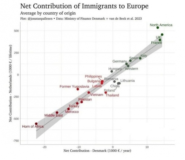 In absolutni antirekorder so najrevnejše države Bližnjega vzhoda in Afrike. En tak migrant proračun v 40 letih stane 400–600 tisoč evrov. To pomeni, da je vsak migrant enak dobri nizozemski vili… le da davkoplačec nima vile, ampak neskončen ček za preživetje nekoga drugega.