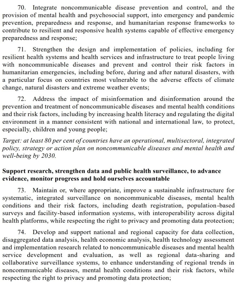 "Vključite preprečevanje in obvladovanje nenalezljivih bolezni ter zagotavljanje duševnega zdravja in psihosocialne podpore v okvire za preprečevanje, pripravljenost in odzivanje na izredne razmere in pandemije ter humanitarno odzivanje, da bi prispi k odpornim in odzivnim zdravstvenim sistemom, ki so sposobni učinkovite pripravljenosti in odzivanja na izredne razmere." Odstavek 70.