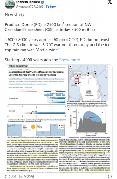 Študija, objavljena v reviji Nature Geoscience pod naslovom »Deglaciacija Prudhoe Dome na severozahodu Grenlandije kot odgovor na segrevanje v holocenu«, kaže, da Prudhoe Dome, 2500 kvadratnih kilometrov širok del grenlandske ledene plošče, takrat ni obstajal. Območje, ki ga danes prekriva led, debel do 600 metrov, je bilo takrat popolnoma brez ledu. In to na severozahodu Grenlandije, ne na njenem južnem koncu.