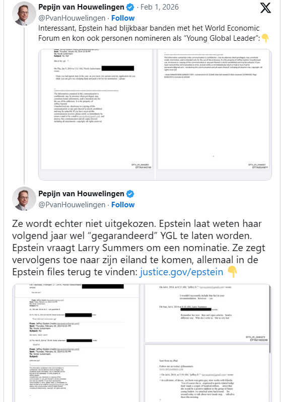 V razkritem elektronskem dopisovanju iz leta 2014 je podrobno opisano, kako se je Jeffrey Epstein predstavljal kot posrednik znotraj mreže Svetovnega gospodarskega foruma (WEF) – zlasti v zvezi s prestižnim programom Mladi globalni voditelji (YGL).