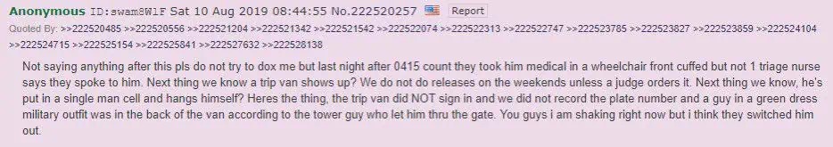 "Manj kot uro preden je prišla v javnost prva novica, da so Jeffreyja Epsteina našli nezavestnega v njegovi celici, se je na skrajno desničarski platformi pojavila skrivnostna ob o njegovi smrti." NBC je dodal: