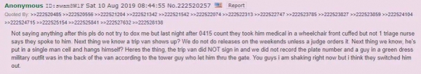 "Ne bom povedal ničesar več, prosim, ne poskušajte me identificirati, ampak sinoči po štetju ob 04:15 so ga v invalidskem vozičku, spredaj vklenjenega, odpeljali v zaporniško bolnišnico, vendar nobena medicinska sestra ne pravi, da so se z njim pogovarjali."