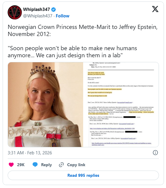 Mette-Marit, bodoča norveška kraljica, se ni le spogledovala s temi elitističnimi idejami; sprejela jih je tudi zasebno. Njeno ležerno navdušenje nad prihodnostjo, v kateri prevladujejo laboratoriji, se popolnoma ujema z Epsteinovim načrtom in sproža vprašanja o tem, kaj globalna elita dejansko namerava za človeške krvne linije.