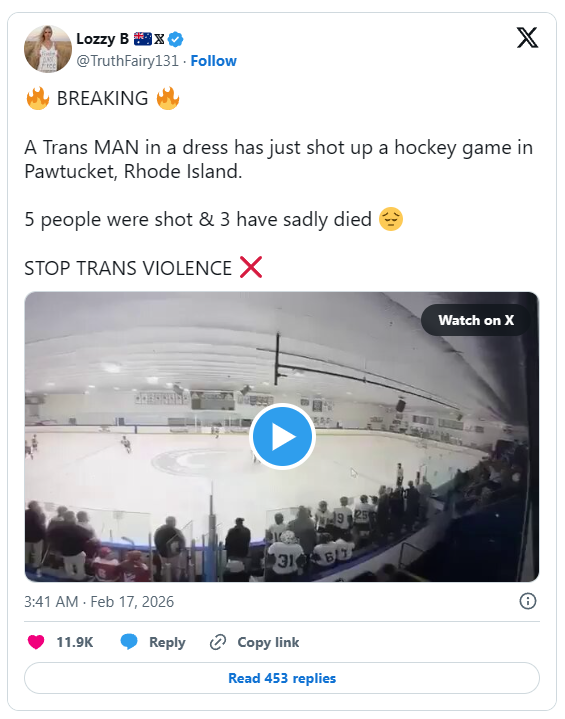 Moški v obleki, ki se je predstavil kot transspolna ženska, je v ponedeljek popoldne med hokejsko tekmo v dvorani Dennis M. Lynch v Pawtucketu na Rhode Islandu nenadoma odprl ogenj na svojo družino. Ubita sta bila dva človeka in storilec, trije pa so bili hudo ranjeni.