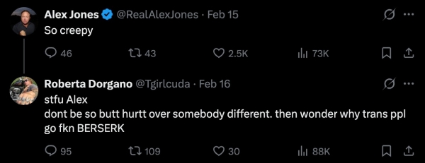Tik pred tem se je izrazil na zelo podoben način kot desničarski voditelj Alex Jones: »Je*i se, Alex. Ne jezi se tako zaradi nekoga drugačnega. In potem se vprašaj, zakaj so transseksualci prekleto NORI.«)