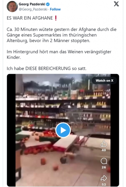 V četrtek so kupce v supermarketu v Altenburgu v Turingiji v Nemčiji pričakal nenavaden prizor: Afganistanec je divjal približno 30 minut, preden sta ga ustavila dva moška. V ozadju se je slišalo kričanje prestrašenih otrok.